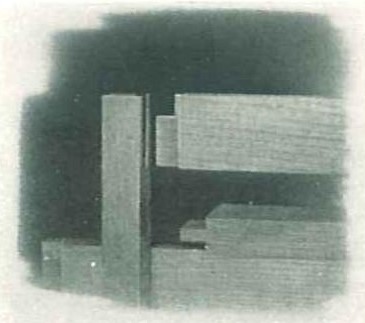 A feature of Curtis stair construction which saves time for the carpenter is the “housing” of the wall stringers. The treads and risers, which are tongued-and-grooved together as shown above, on the right, are WEDGED into the housing, not nailed. This is the most satisfactory stair construction that has so far been devised to eliminate creaking and “giving.” This picture is taken from the under side of the stair.