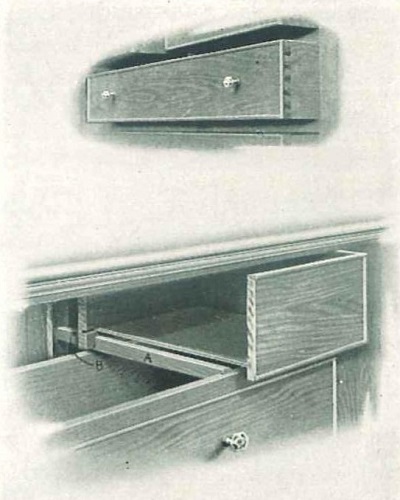 All but the smallest drawers in Curtis permanent furniture are made with dovetailed corners that cannot pull apart. They operate on slides (A), which prevent wobbling and binding. The laminated drawer bottoms are set into grooves in the sides and ends of the drawers. The bottoms cannot shift about.