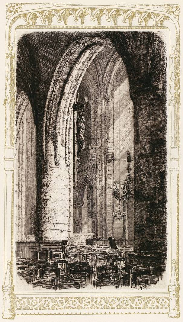 Si nous passons maintenant aux détails de l’ensemble, nous trouvons que la voûte est, d’après l’exégèse de l’anonyme du « Psalterium glossatum » du onzième siècle, l’image de la vie céleste, que les piliers sont les apôtres, qu’au dire de Durand de Mende, les colonnes que, de son côté, Petrus Cantor assimile, à cause de leur force, au Christ, sont les Evêques et les Docteurs qui soutiennent l’église par leur doctrine ; que le pavé stipule l’humilité et qu’il figure aussi, parce qu’il est foulé aux pieds, les labeurs mis au service de la Foi, des fidèles ; que le jubé, supprimé presque partout et remplacé par le coquetier, plus ou moins élégant, de la chaire à prêcher, est l’emblème de la montagne du haut de laquelle parlait le Fils.