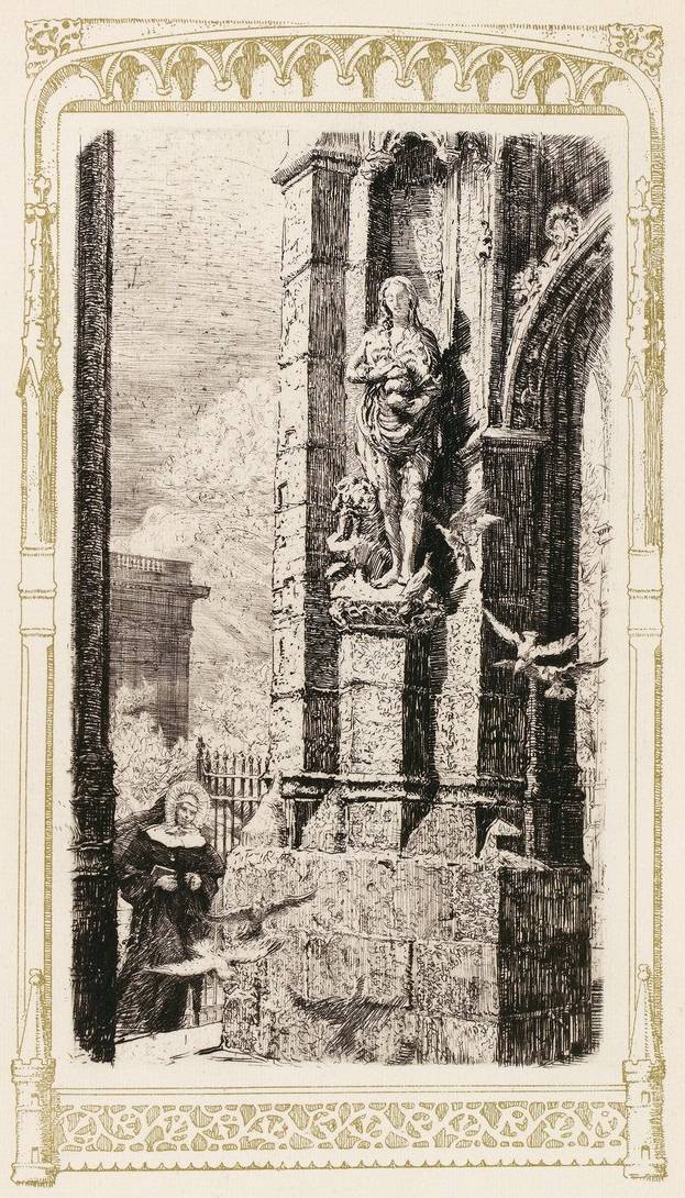 Sous les pieds de l’évêque, sur le socle même de sa statue, de chaque côté, deux ronds de pierre sont sculptés. Les ronds de droite seraient les simulacres de la nature métallique brute, telle qu’on l’extrait de la mine, les ronds de gauche, négligés comme les premiers par la symbolique chrétienne, seraient la même nature métallique mais purifiée ; et celle-là se rapporterait à la figure humaine, assise, dans la chapelle sépulcrale, et qui a pris naissance dans le feu dont son linceul s’entoure. De cette fournaise tombale qui serait l’œuf philosophique, inséré dans l’athanor, le dragon, né à son tour de la figure humaine, serait, en s’élevant hors du fourneau, en plein air, sous les pieds du saint, le dragon babylonien dont parle Nicolas Flamel, autrement dit, le mercure philosophal, le lion vert, le lait de la vierge, la substance même qui change par une projection le plomb en or.
