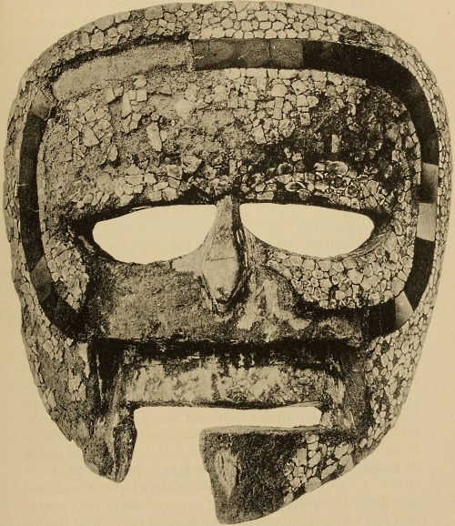 Under the title “Montezuma’s Gifts to Cortés,” Maudslay describes (Appendix, pp. 299-302) and illustrates (pl. 13-16) the three mosaic masks in the British Museum. Pl. 16 is a rear view of the skull mask showing the leather strap by which it was attached to the head. This mask Maudslay identifies as probably that of Tezcatlipoca, and the other two as belonging to Quetzalcoatl.