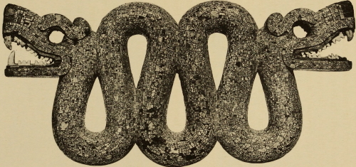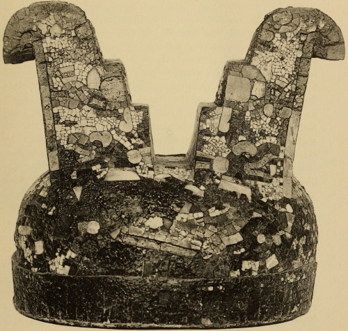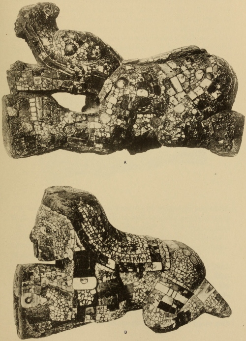 The writer has undertaken the present study of Mexican Turquois Mosaics in honor of the approaching opening to the public of the Museum of the American Indian, Heye Foundation, the only institution devoted exclusively to the study of the aboriginal American peoples ever established; and the proximate International Congress of Americanists to be held at Rio de Janeiro this summer. Owing to lack of time it has been impossible to obtain new photographic illustrations of all the specimens of mosaic-work in European museums, but the author desires to express his thanks to T. A. Joyce, Esq., for his courtesy in furnishing photographs of the examples in the British Museum. To Dr. Franz Heger, of the State Natural History Museum, Vienna, we are under deep obligations for photographs and description of the interesting Xolotl figure preserved in that Museum. Dr. S. K. Lothrop has kindly had photographs made of the objects of this class in the Prehistoric and Ethnographic Museum in Rome, and has made certain valuable observations concerning them. To Drs. A. M. Tozzer and H. J. Spinden special acknowledgment is due for their generous permission to illustrate the mosaics from Chichen Itza, thus anticipating their own description of the objects in the work now being prepared regarding one of the most important discoveries ever made in ancient America. The fine drawings are from the pen of William Baake, and the beautiful plates represent the best efforts of the Heliotype Company. Finally must be acknowledged the characteristic generosity of one of the trustees of the Museum, James B. Ford, Esq., who has made it possible for us to publish this paper, and to whom the Museum is indebted for its acquisition of the precious collection of Mexican mosaics which are now described for the first time.