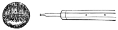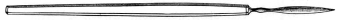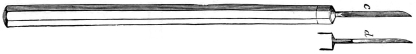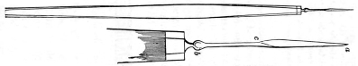 8. The knife-needle, which I invariably use, is a modified pattern of that devised by Hays. The form of this instrument lies midway between the falciform knife and the bistoury, and possesses the advantages of both. It has a very delicate point which punctures easily, and an excellent cutting edge of sufficient length (7 mm.). If the shank is properly rounded it can be used with a sawing motion, sliding backward and forward through the corneal puncture without injuring the cornea, and without allowing the aqueous to escape. To accomplish this the more easily, the shank has been made 4 mm. longer than the original model. This instrument, therefore, seems to meet all the requirements of a perfect iris-knife, viz., a falciform point which makes the best puncture, a straight edged blade which makes the best incision, and a cutting edge 7 mm. long, which is the best length for properly executing the sawing movement. My model32 of knife-needle (Fig. 37) resembles Cheselden’s knife, as shown by Sharpe (Fig. 4), even more closely than the original pattern of Hays does.