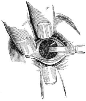 During the following seventeen years no notable advance was made, the scissors method still retaining its hold on the profession, until in 1869, von Graefe, after long reflection, became convinced of the dangers of that method, and communicated to one of his pupils, M. Meyer, his method of simple iridotomy performed with the knife-needle. Meyer19 quotes his views as follows: