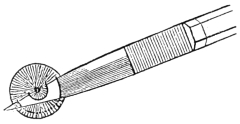 Second Stage.—The point is now allowed to rest on the iris-membrane, and with a dart-like thrust the membrane28 is pierced. Then without making pressure on the tissue to be cut, the knife is drawn gently up and down with a saw-like motion, until the incision has been carried through the iris tissue from the point of the membrane puncture to just beneath the point of the corneal puncture. This movement is made wholly in a line with the axis of the knife, the shank passing to and fro through the corneal puncture, and the loss of any aqueous being carefully avoided in the manipulation.