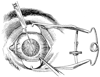 DeWecker makes only a casual reference to Maunoir’s method, but credits Janin with the original suggestion of the method which he has thus elaborated. Nevertheless, it is quite evident that DeWecker’s method was simply a modification of the one outlined by Maunoir seventy years before. Furthermore, he lays down the same rule that Maunoir first offered: “Always cut parallel to the radiating fibers and perpendicularly to the circular fibers of the iris.”