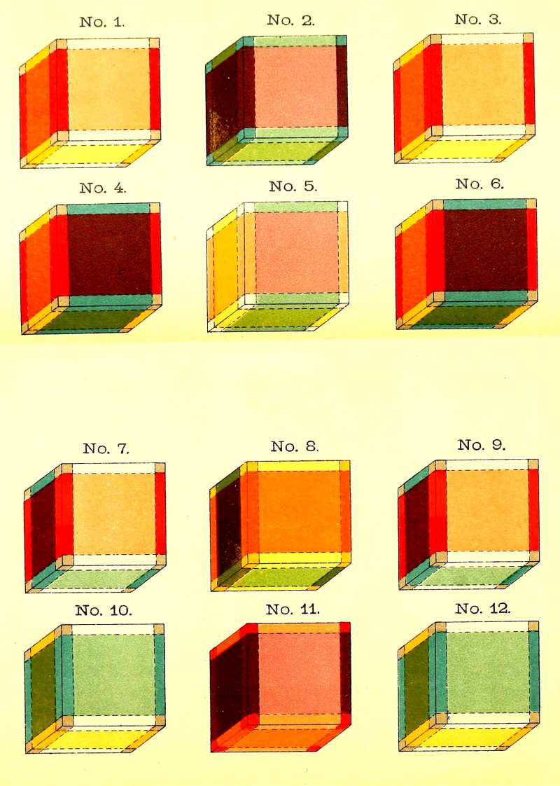 These form a word in which the first letter gives the place of the cube upwards, the second letter its place towards the observer, the third letter its place to the right.