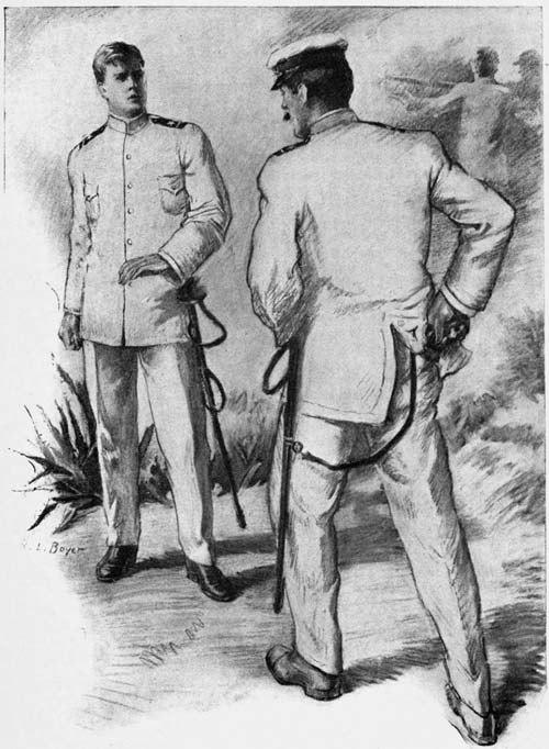 “That’s certainly hard luck. Why couldn’t I have been assigned to his division instead of you?” exclaimed he, generously. “I never liked him, but he doesn’t know me from an[15] old shoe, and he has a good reason to know you.” Then, reminiscently, “I can remember his face after your fight with him as plainly as if it were yesterday; the referee called it a draw, but every one knew that you had the better of the fight. He was in the hospital for a week until his face healed up, while you were in ranks at the next formation, with no more marks than I give myself daily shaving.”