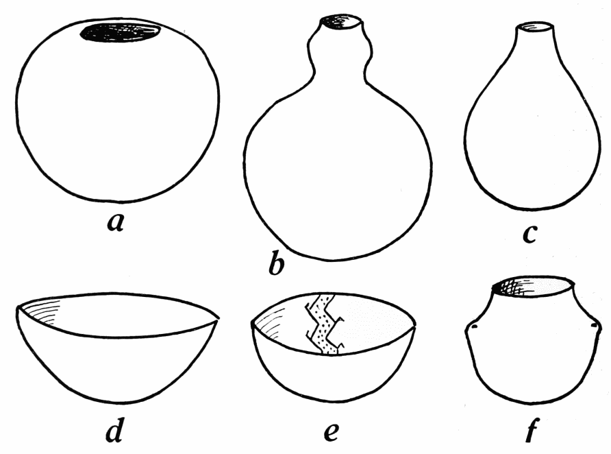 Post-Basket Maker pottery is simple in form and in decoration. It is normally light gray in color. The vessel forms most commonly found are bowls (fig. 1, d, e), globular vessels with restricted orifices (fig. 1, a), and water jars, the latter often having a swollen neck (fig. 1, b). The body of the ware in cross-section has a markedly granular appearance, due to the large size of the bits of tempering material included in it. A small percentage of the bowls bear a thin white slip on the interior