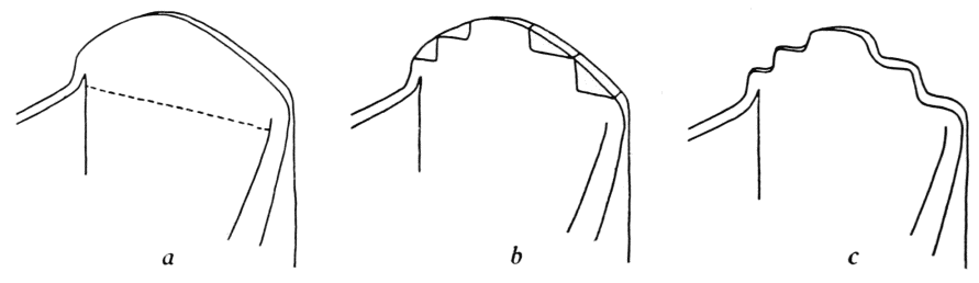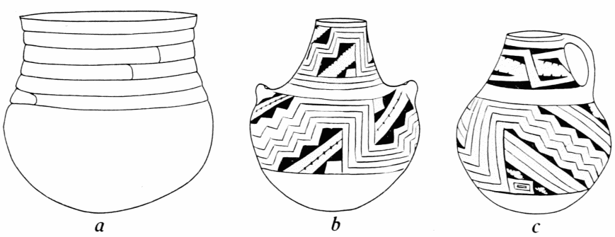 From post-Basket Maker times down to the present day, however, the development of Southwestern pottery can already be outlined with considerable confidence. The next stage is usually called the pre-Pueblo. It is marked by further improvements in house-building, by the introduction of cranial deformation, and by certain innovations in ceramics. It had been the custom with the post-Basket Makers (as among many primitive people) to build up their vessels by adding to the growing walls successive rings of clay. When the process was complete and the sides had reached the requisite height, all trace of the rings was obliterated by rubbing down the surface. In the interiors of some post-Basket Maker pieces, however, with orifices so small that a smoothing tool could not be introduced, there were left the telltale junction-lines between the structural rings. In pre-Pueblo times it became the fashion purposely to leave unsmoothed the last few rings at the necks of certain small cooking vessels (fig. 2, a; pl. 2, a). This was the beginning of the elaborate coiled or corrugated technique, later so widely used.