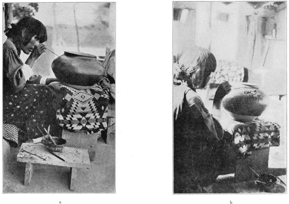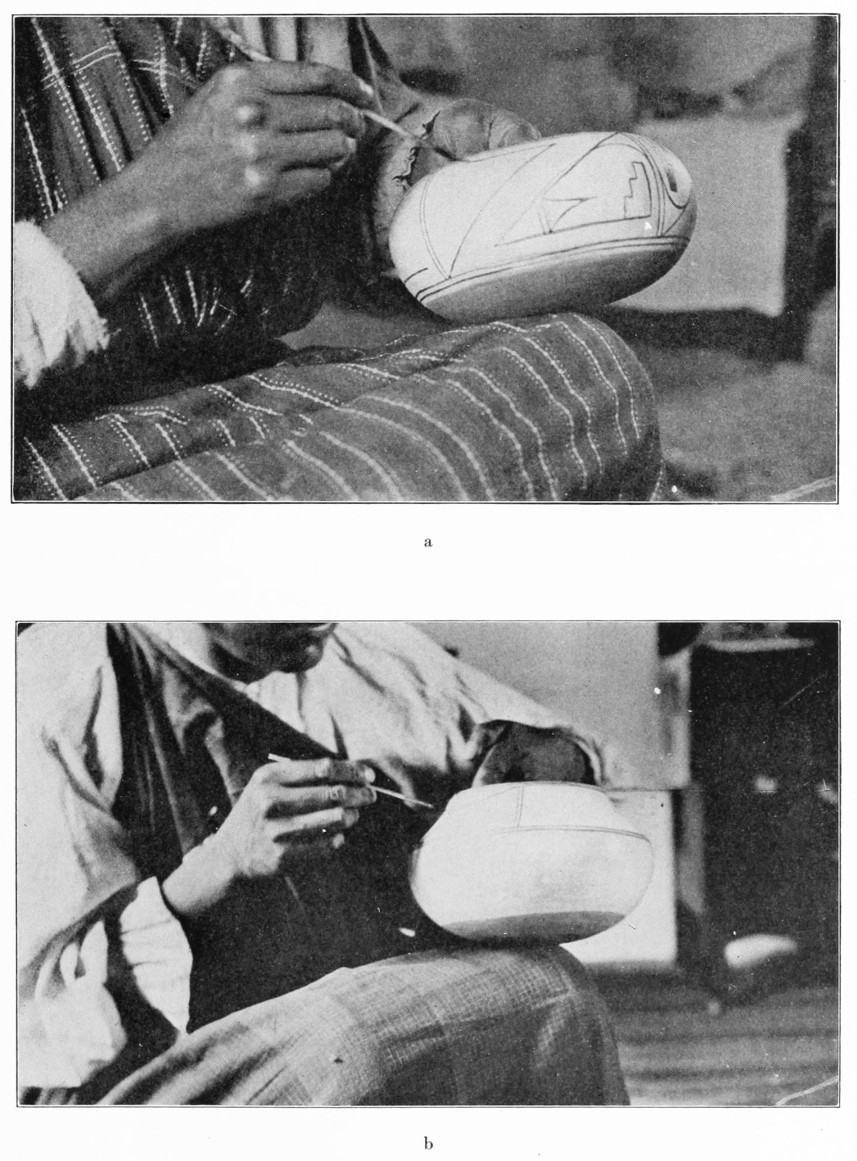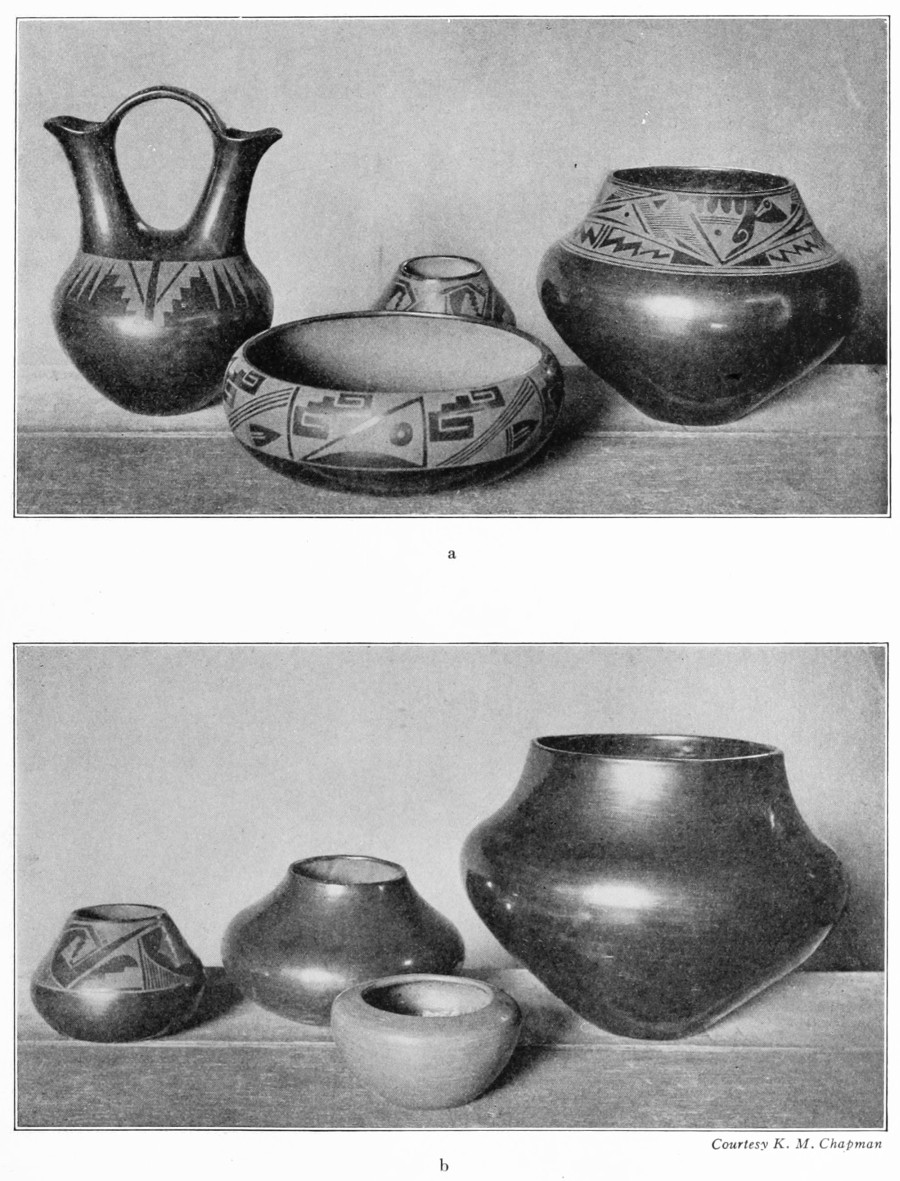 [45] The use of this paint for producing designs upon polished black ware was discovered by Maria Martinez in June, 1921. On inquiring why other potters did not copy the process, it was learned that because of certain taboo-like restrictions the secret of making this kind of ware would not be disclosed until a year after its discovery. Although the matter could not be further investigated because of the unwillingness of the Indians to discuss such things, it would appear that we have in this case a sort of primitive patent-right. At the present time (1925) practically all San Ildefonso potters make this ware, which has proved extraordinarily popular; Maria, however, still produces by far the finest pieces (see pl. 8, a).