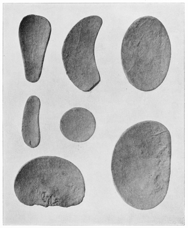 [20] Stevenson, in speaking of the making of pottery at Santa Clara, mentions “the process of polishing—with smooth, fine-grained stones”, (1883, p. 331). In his catalogue of stone objects collected at Zuñi in 1881, he differentiates between “small stones used in polishing pottery”, “small stones used in polishing unburned vessels”, and the “small polisher for glazing and smoothing pottery”, giving three different Indian names for the three kinds. He does not, however, explain the difference (1884, pp. 525, 526). He also catalogues “fifteen rubbing or smoothing stones for pottery” obtained at Walpi (1884, p. 587). Mrs. Stevenson remarked: “Polishing stones are used to finish the surface” of vessels at Zuñi (1904, p. 375).