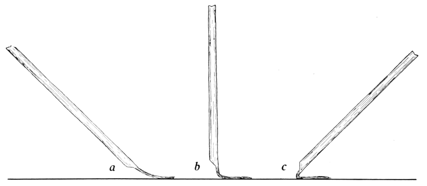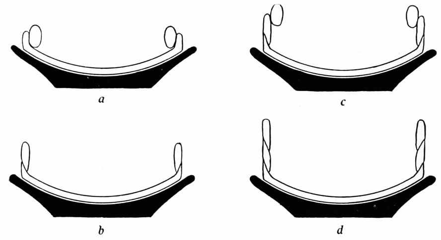 [36] Potsherds from pre-Spanish ruins show that handles have been applied to vessels in the ways described above for many centuries. The lug-type of handle, which is frequently found in ancient pottery, is no longer made at San Ildefonso. The probabilities are, however, that these lugs were welded to the exterior of the vessel, as in the first method described, rather than riveted on as in the second method.