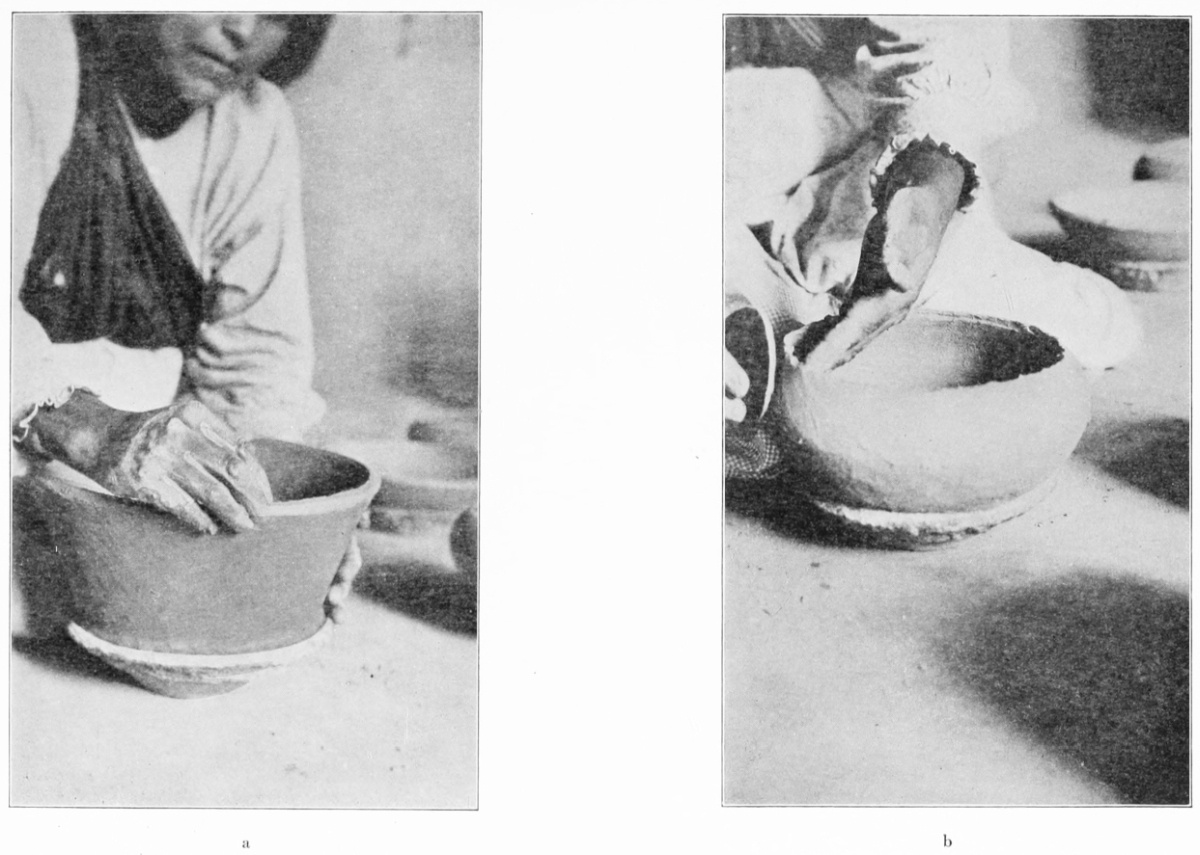 [25] Zuñi potters apply the roll to the outside instead of the inside of the growing vessel wall; otherwise the handling of the roll is exactly as at San Ildefonso (see pl. 29, b).