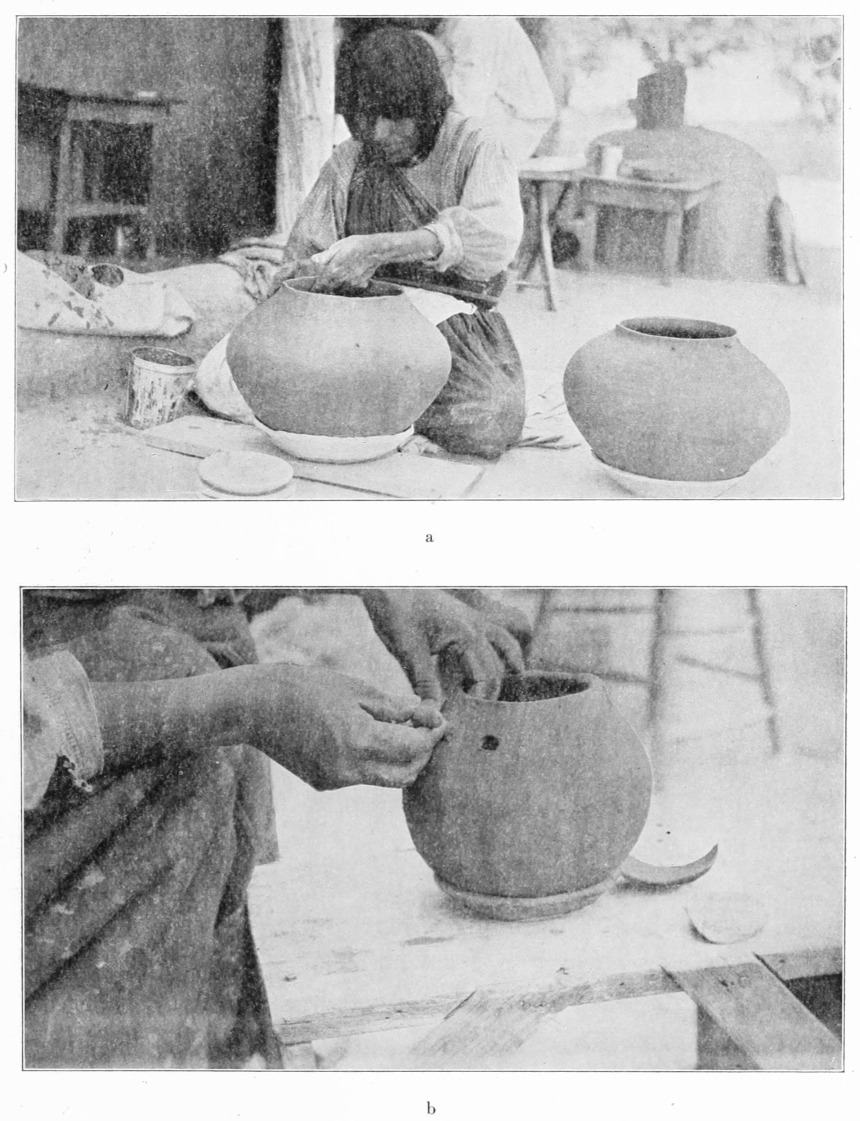 [24] I use the words “very skillfully” advisedly. Repeated attempts on my part to imitate the process resulted in rolls of exceedingly variable diameter. At Zuñi the roll is made by the apparently simpler and more efficient method of rolling the clay back and forth on a flat stone slab with one hand (see pl. 29, a).