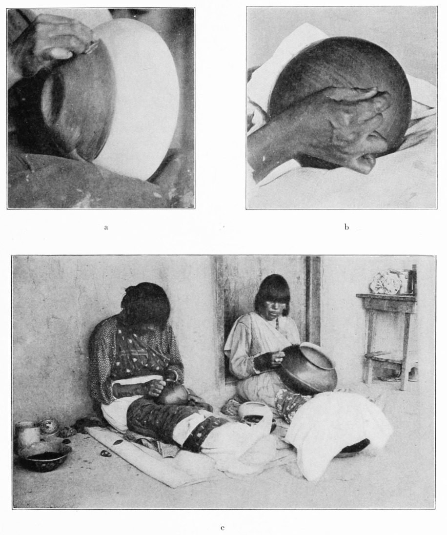 [18] Stevenson, in 1879, observed at Zuñi that “the bottoms of old water jars and bowls form stands for the articles while being worked by the potter. The bowls are filled with sand when objects of a globular form are to be made” (1883, p. 329). At Pojuaque (a Tewa pueblo near San Ildefonso, now nearly extinct) he collected two “pottery moulds for bottoms of vessels” (loc. cit. p. 439). Mrs. Stevenson also noticed these olla bottoms at Zuñi (1904, p. 374).