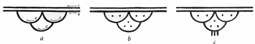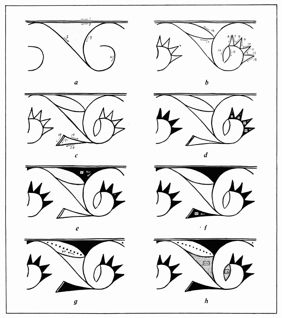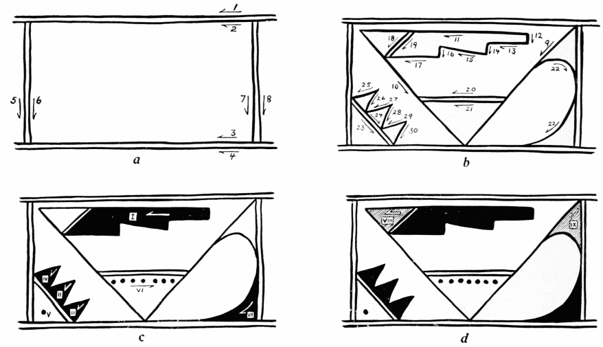 Pre-Pueblo black-on-white ware takes the form of bowls, pitchers, ladles, small jars, and ollas. Its paste is hard, is less heavily tempered than post-Basket Maker{8} paste, and the surfaces of the pieces are better smoothed. The decoration is characterized by boldness and dash, the brushwork being correspondingly hasty. The lines are of irregular width, nor was care exercised that the junctions of strokes should be accurate. As is shown by the accompanying drawings (fig. 2, b, c), the commonest elements are the stepped figure and the triangle, both often emphasized by sets of widely spaced thin lines which follow the outer edges of the basic patterns.