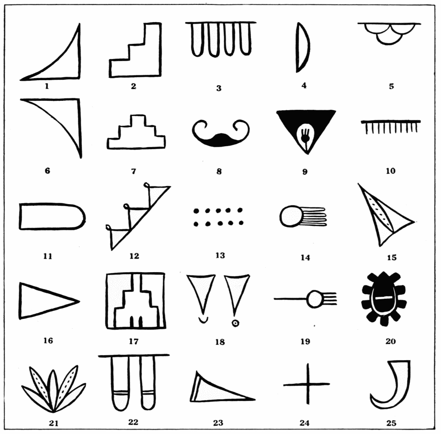 The elements illustrated in figure 11, give examples of the type of idea or object said to be represented, and incidentally illustrate some of the contradictions spoken of above. Numbers 1 and 6 both refer to hills. On the other hand, No. 7{88} is a mountain, although it bears little resemblance to the “hills”. It resembles more closely No. 2 which one informant described as a pueblo and another as a kiva. The same regular zigzag appears in No. 12, which represents a tablita, or dance mask, with small feathers tied to the points of the zigzags. No. 17, in which the zigzag also appears, represents kiva-steps. Nos. 11 and 16 represent feathers, and No. 21 is a bunch of feathers on the end of a dance-pole. But No. 22 represents the poles of the kiva-ladder, and No. 3 is rain, which is falling a long way off. No. 10 represents fringed woolen armlets, and yet there is as close a resemblance between Nos. 3 and 10, as there is between Nos. 14 and 19, both of which represent the tassels on a man’s dance-belt. No. 8 is called rain-water, but a single spiral, as in No. 25, is a buffalo horn. The dots of No. 13 represent rain-drops in dust, but in No. 21 the dots are markings on feathers, and in No. 15 they represent a procession of bugs on the rib of a leaf. No. 18 represents water dripping through a hole in the roof and making a small cup-like depression in the floor, represented by a semicircle, or a whole circle with a dot in the centre of it; but No. 23, which is also a triangle, is called a leaf, as is also the case with No. 15. And yet No. 4 is also a leaf, although if placed horizontally it more closely resembles the clouds represented in No. 5. But No. 9 is also a cloud, this time a big black cloud with an open space in it through which a small cloud may be seen. Nos. 20 and 24 represent respectively the sun and a star.