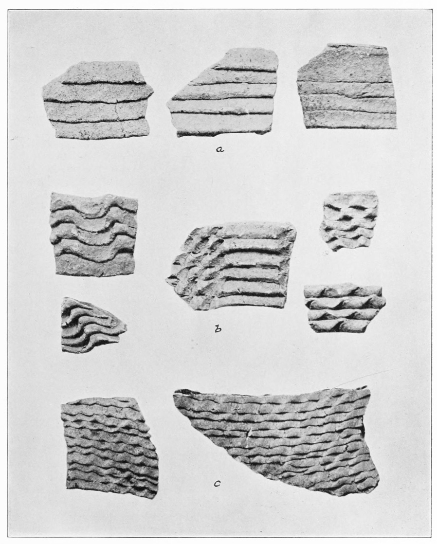 [33] From the earliest periods Southwestern pottery has been made in more or less the manner just described, that is, by the addition of successive rings of clay. During prehistoric times, however, there was developed a ware usually known as “corrugated”, in the building of which the roll was so lengthened as to become a spiral coil. The roll of paste forming the coil was very thin, averaging a little over one-quarter of an inch in diameter; and it was applied to the outside of the temporary rim, as at Zuñi (see pl. 29, b), instead of to the inside, as at San Ildefonso. Furthermore, the junctions between the coils were not obliterated on the exterior of the vessel, thus producing a ridged or corrugated effect. Corrugated pottery was principally used for cooking pots (see Holmes, 1886, p. 273).