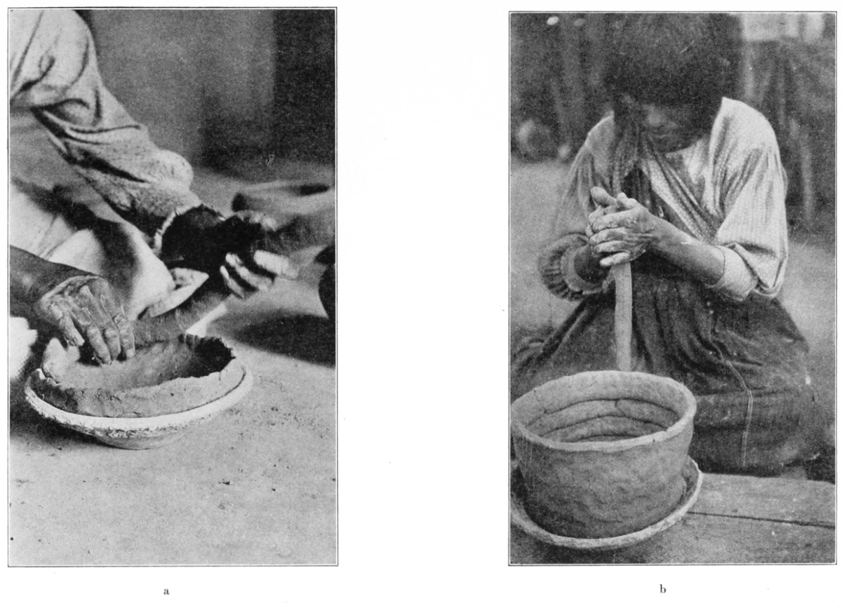 [24] I use the words “very skillfully” advisedly. Repeated attempts on my part to imitate the process resulted in rolls of exceedingly variable diameter. At Zuñi the roll is made by the apparently simpler and more efficient method of rolling the clay back and forth on a flat stone slab with one hand (see pl. 29, a).