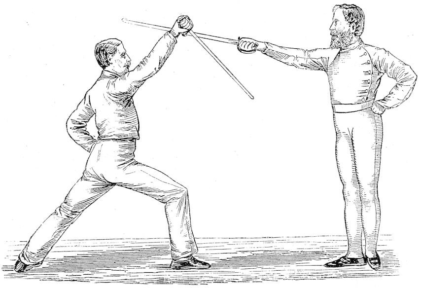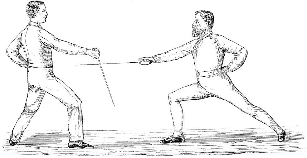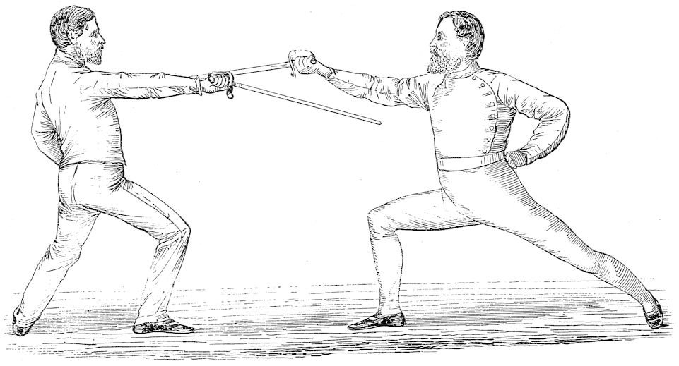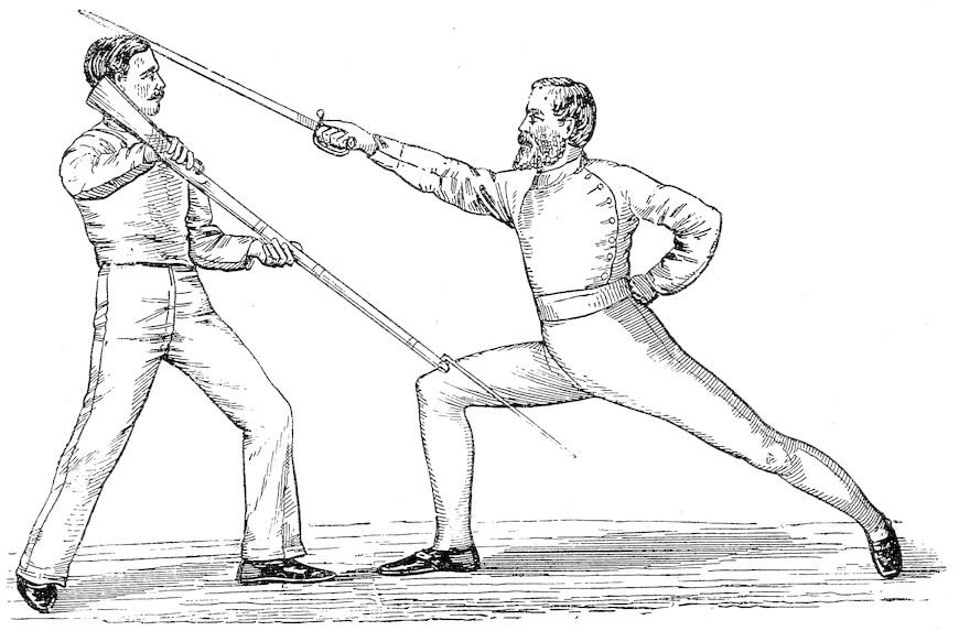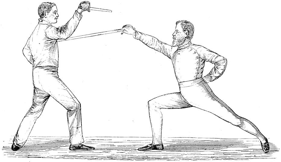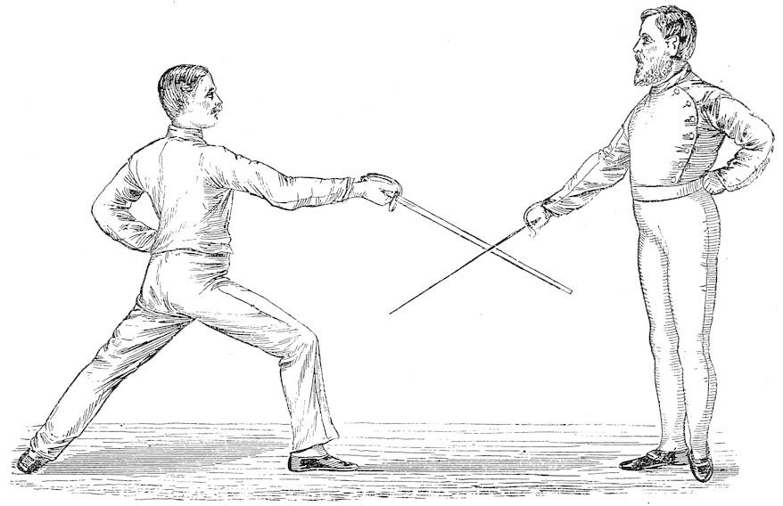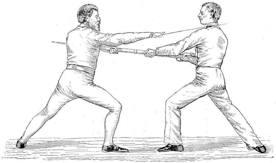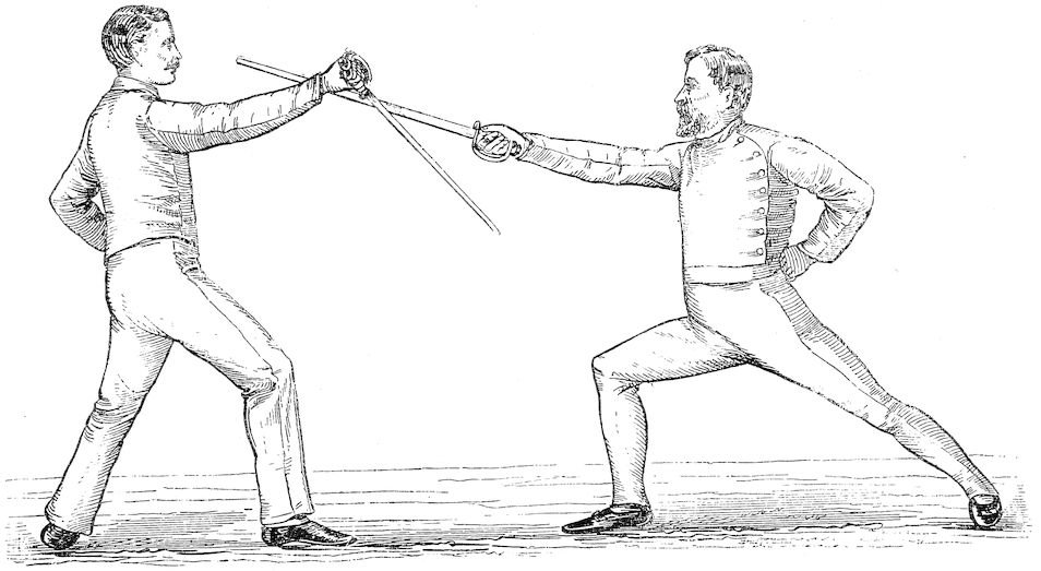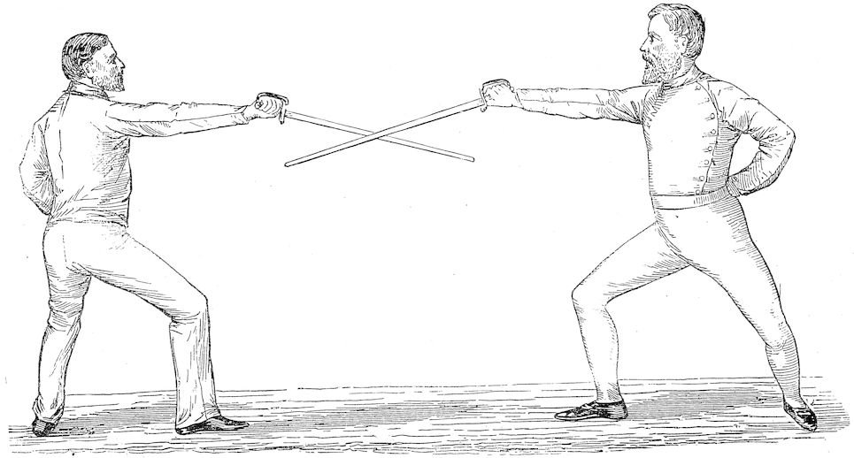 On crossing swords, which should be about nine inches from each other’s point, when it is called an equal engagement, press your blade gently upon that of your adversary, so as to close the line in which you are engaged. By this means you are protected from a straight thrust.