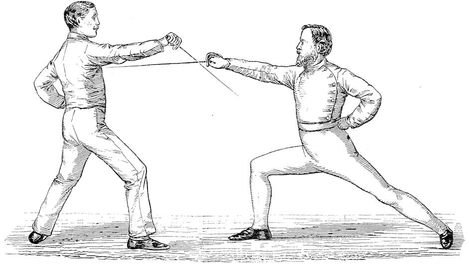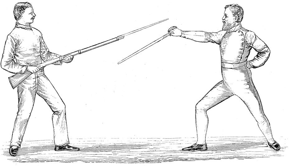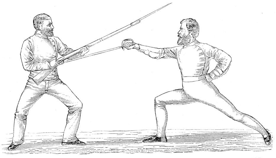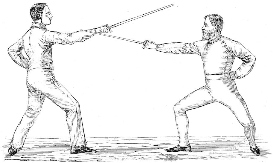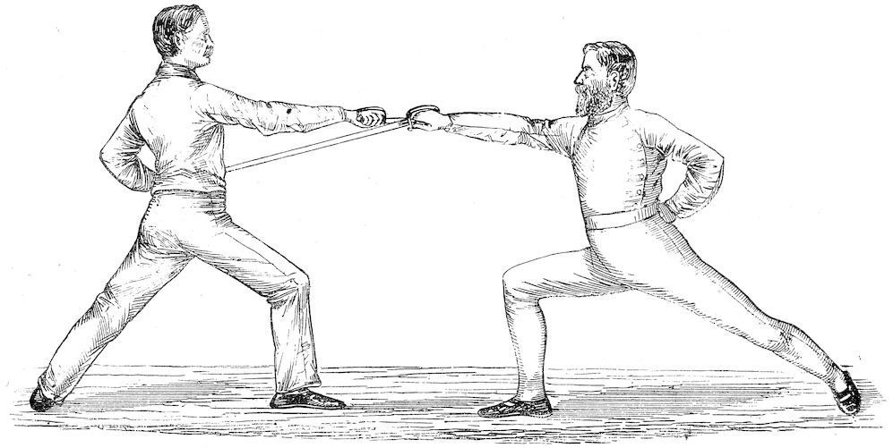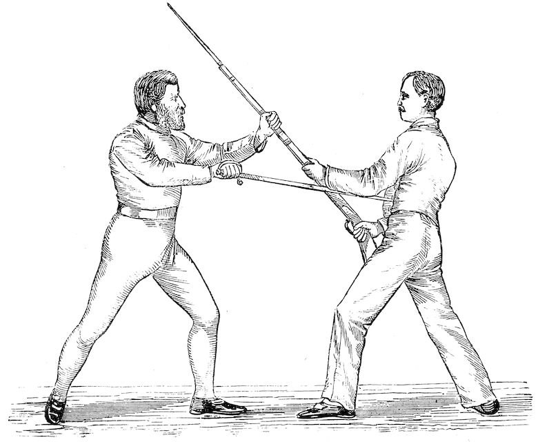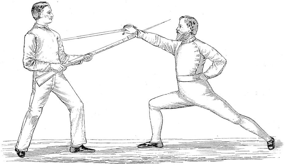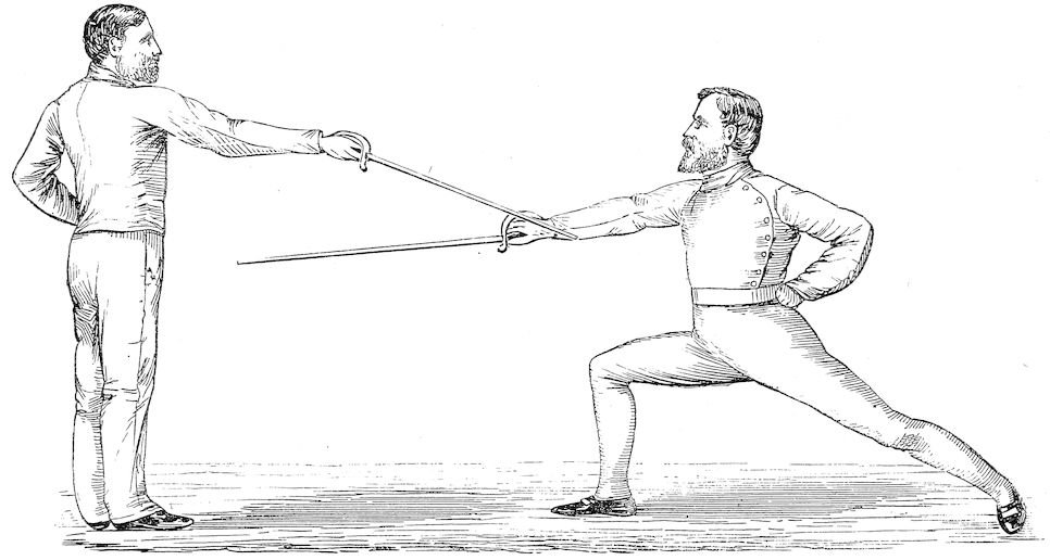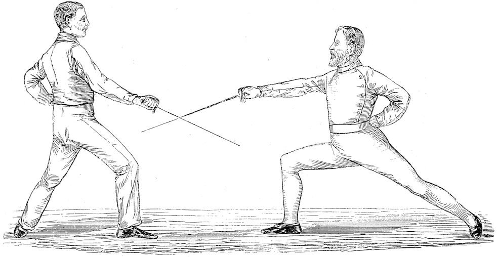 On crossing swords, which should be about nine inches from each other’s point, when it is called an equal engagement, press your blade gently upon that of your adversary, so as to close the line in which you are engaged. By this means you are protected from a straight thrust.
