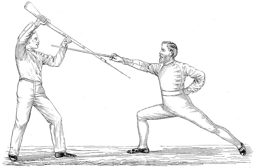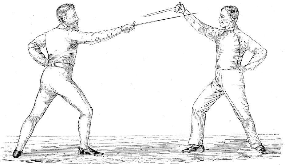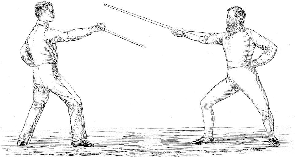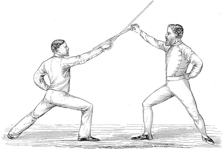 12th.—When the signal is given the combatants can cut at one another—taking care not to wound their adversary with the point of their sabre—can stoop, advance, retire, turn round, vault, &c., and stop only when the seconds tell them to: such are the rules of the combat.