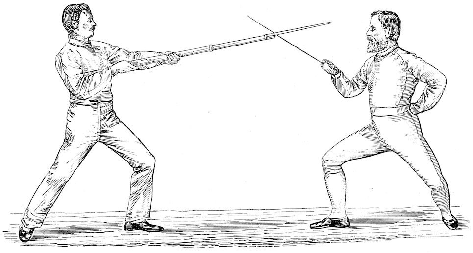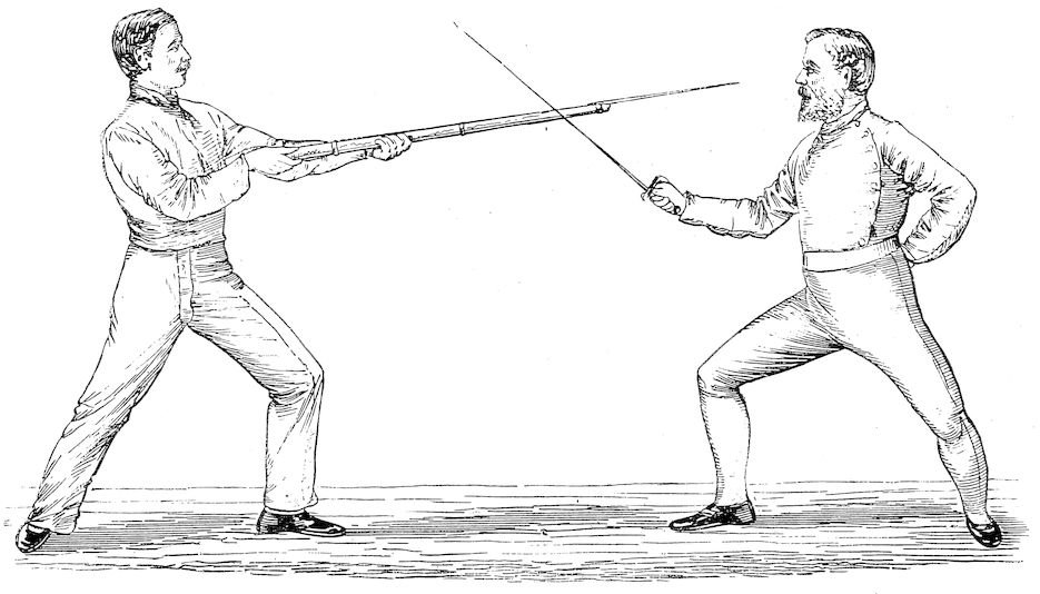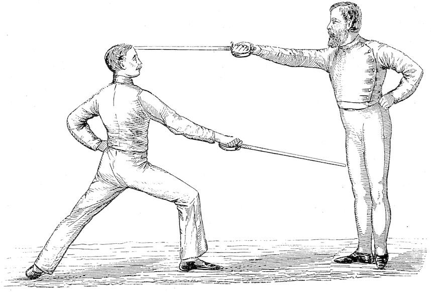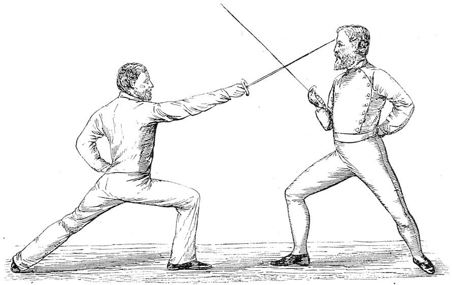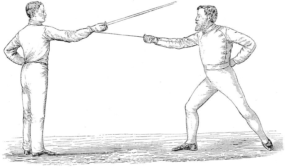 3rd.—The seconds having agreed upon the choice of the ground the most proper for the combat—level and equal for the two opponents—must mark the two places, the distance being calculated as if the two opponents were both on the 146longe and the points of the two sabres one foot apart.