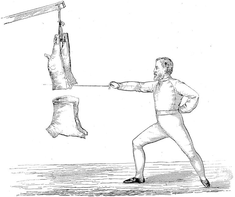 Stretch the sword-arm to its full length as quickly as possible on a level with the shoulder, without stiffness or jerking or any preliminary movement, and direct the edge or point of your sword to the part you wish to hit. Raise the toes of the right foot, and step straight to the front, 23until the feet are about four times the length of your foot apart; let the heel touch the ground first.