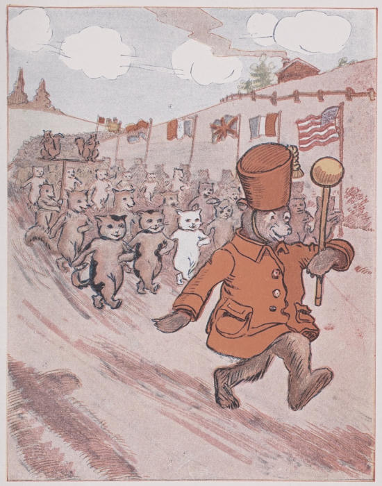 Twinkle Toes marched ahead of the Three Little Kittens and they took turns carrying the flag.