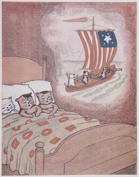 When night came, the Three Little Kittens dreamed that they were sailing away in a sailboat with Uncle Mouser and Twinkle Toes, and that the sailboat had a sail like our flag red, white, and blue.