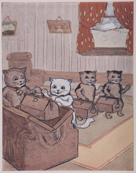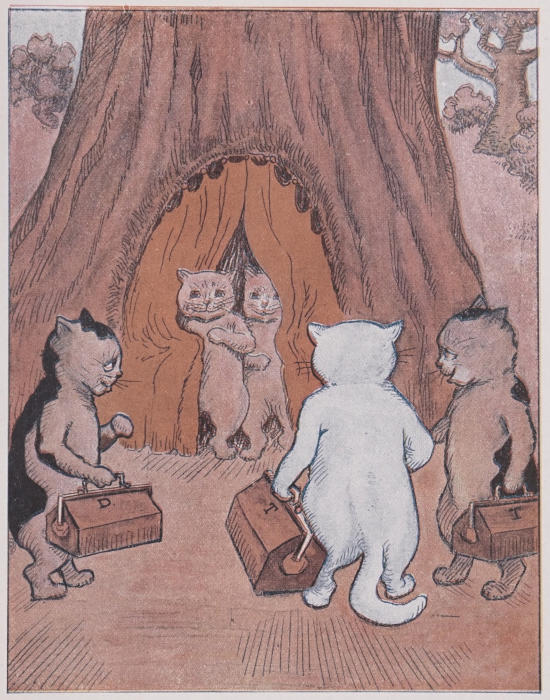 The Three Little Kittens were happy you may be sure, and marched round and[12] round the room with their new travelling bags.