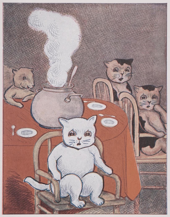 The Three Little Curly-Tails would not wait, they were so hungry. They put their paws in the kettle and burned them badly.