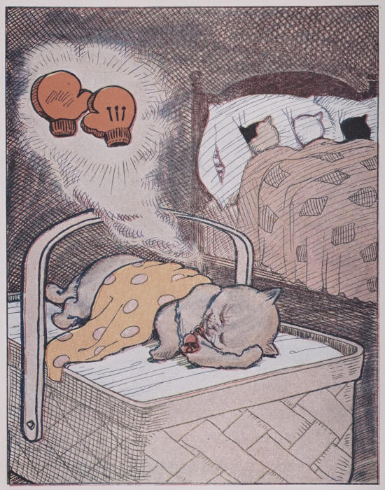 Old Mother Kit-Cat stood in the doorway looking for them and she said, “Oh Uncle Mouser, your red plush-lined basket is waiting for you.”