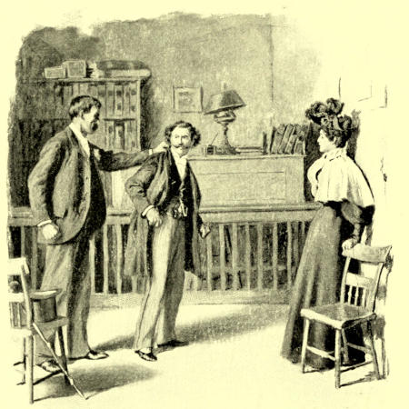 He was a small man, who still was wearing the clerical habit of his last criminal masquerade;[9] and his face carried out the suggestion of his costume, being an actor’s face, not only in the clean-shaven cheeks and lips, but in the flexibility of the features and the unconscious alertness of gaze. He was fair of skin, and his light-brown hair was worn off his head at the temples. His eyes were fine, well shaped, of a beautiful violet color, and an extremely pleasant expression. He looked like a mere boy across the room in the shadow, but as he advanced, certain deep lines about his mouth displayed themselves and raised his age. The sunlight showed that he was thin; he was haggard the instant he ceased to smile. With a very good manner he greeted the sheriff, to whom he proffered the sole chair of the apartment.