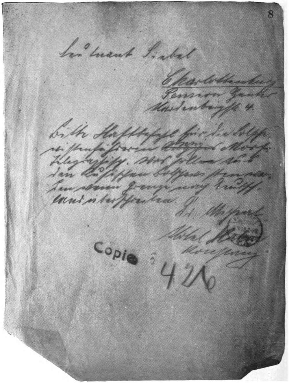 Am 7. August 1919, vormittags 9 Uhr, wurde vor dem Hause Königin-Augusta-Straße 31 zu Berlin eine männliche Leiche aus dem Landwehrkanal geborgen; der Körper war bis auf Schuhe und Hut völlig bekleidet; die Beine waren in eine um die Knie verknotete graue Decke gewickelt; eine hanfene Waschleine verband beide Knie und hielt sie an den Hals gezogen, wo sie in einer Schlinge endete; die Arme waren frei. – Der Gerichtsarzt nahm Selbstmord an.
