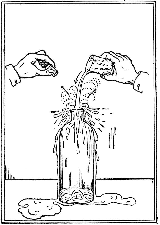 Take the stopper out of a bottle and endeavor to pour water into it rapidly and see what happens. (See Fig. 1.) One of the laws in Physics is that no two bodies can occupy the same space at the same time. After doing this experiment, you will come to 5the conclusion that the bottle does contain something, and that “something” is matter, and that matter is air. There is in the bottle probably as important a thing as you could possibly conceive of, because even this earth without its ocean of air would be a world of desolation; for air sustains life itself, and when agitated, develops great strength. It may be whirled about into a hurricane blast and assume such violent proportions that villages will be swept away, and great waves of water will be raised, upon which ships can be tossed about like so much chaff. We all know that air can become so cold that great suffering will be caused, and so hot that it will make life almost unbearable. We really live in an ocean of air.