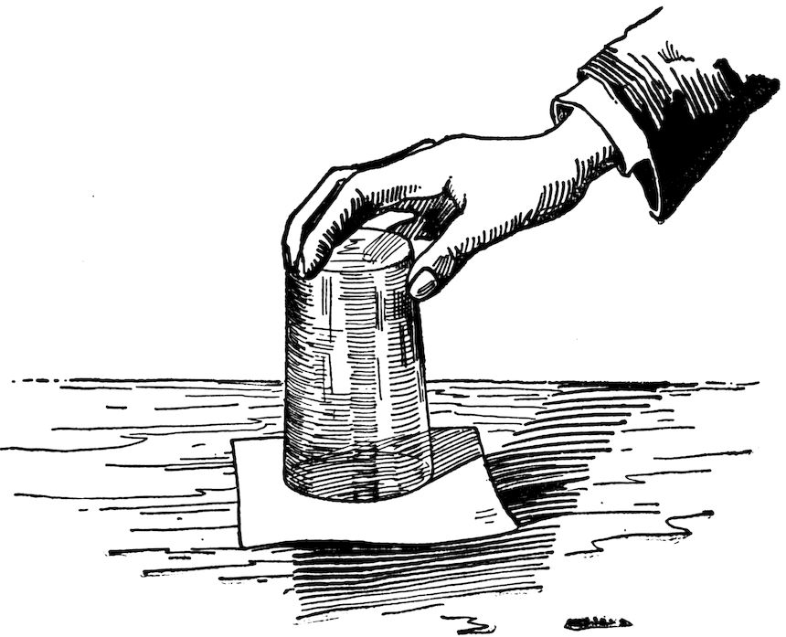 A tumbler is filled with water and a piece of paper placed over the top of it. The glass is then inverted, holding the hand over the paper so that none of the water will come out. On taking the hand away, although the glass of water is inverted, the contents do not leave the glass. (See Fig. 4.)