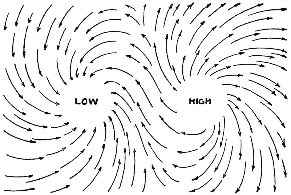 76The arrows denote the direction of the wind, and you will notice they point to the region of low barometric pressure. In the regions of high barometric pressure the winds are in the opposite direction. This readily explains to you why it is that you can expect changes in weather conditions when the wind changes.