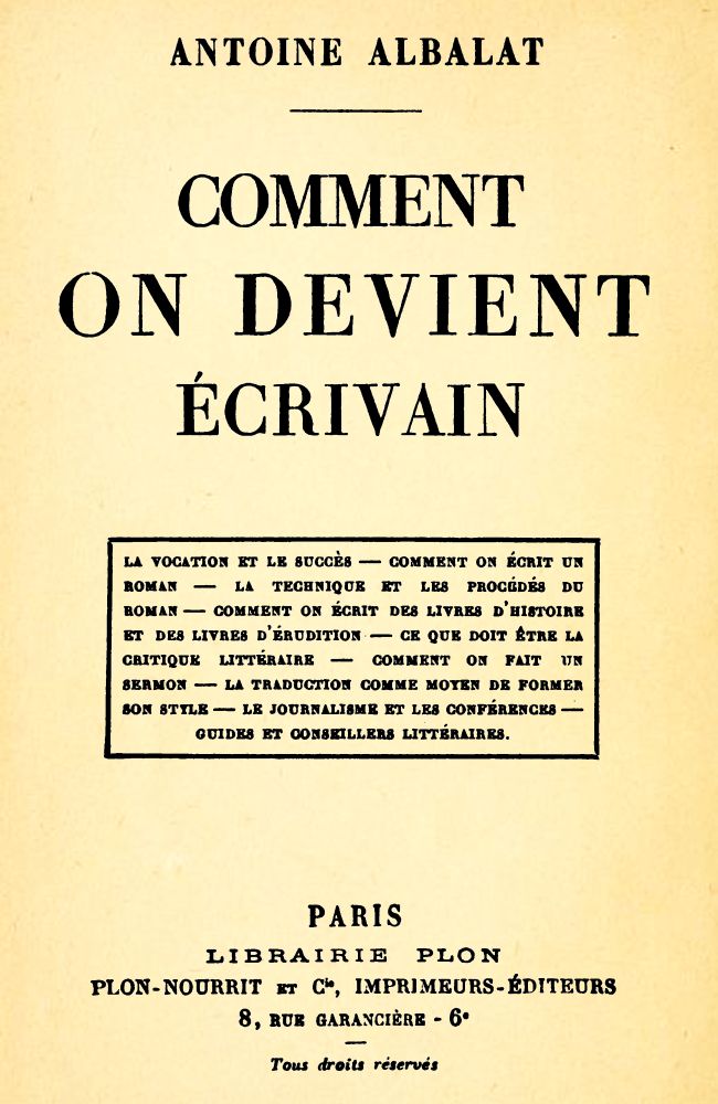 LA VOCATION ET LE SUCCÈS — COMMENT ON ÉCRIT UN ROMAN — LA TECHNIQUE ET LES PROCÉDÉS DU ROMAN — COMMENT ON ÉCRIT DES LIVRES D’HISTOIRE ET DES LIVRES D’ÉRUDITION — CE QUE DOIT ÊTRE LA CRITIQUE LITTÉRAIRE — COMMENT ON FAIT UN SERMON — LA TRADUCTION COMME MOYEN DE FORMER SON STYLE — LE JOURNALISME ET LES CONFÉRENCES — GUIDES ET CONSEILLERS LITTÉRAIRES.