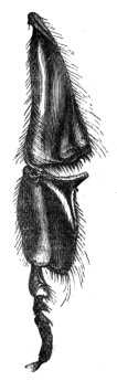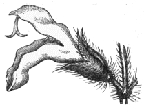 The next figure represents the very curious arrangement of the stamens in the Erica tetralix, or common heath. These, eight in number, are seen standing round the style, at about half its length. Each is held by a long filament (only one of which is shown in the figure), and is armed with a horn-like process. When the anthers are ripe, the pollen would escape from openings in their sides, were it not that the little slits abut on each other. When, - 256 - however, a bee visits the flower, and thrusts up her proboscis, this strikes against one of the little horns, and pulls apart its anther from the rest. Pollen then drops on the bee's head, to be carried by it to other blossoms, which, while receiving a portion brought to them, in their turn give the bee a supply to carry to other flowers. It is a very salutary thing for the propagation of the heath that bees have such a strong liking for its nectar, and are thus induced to perform, albeit unconsciously, the process of fertilisation.