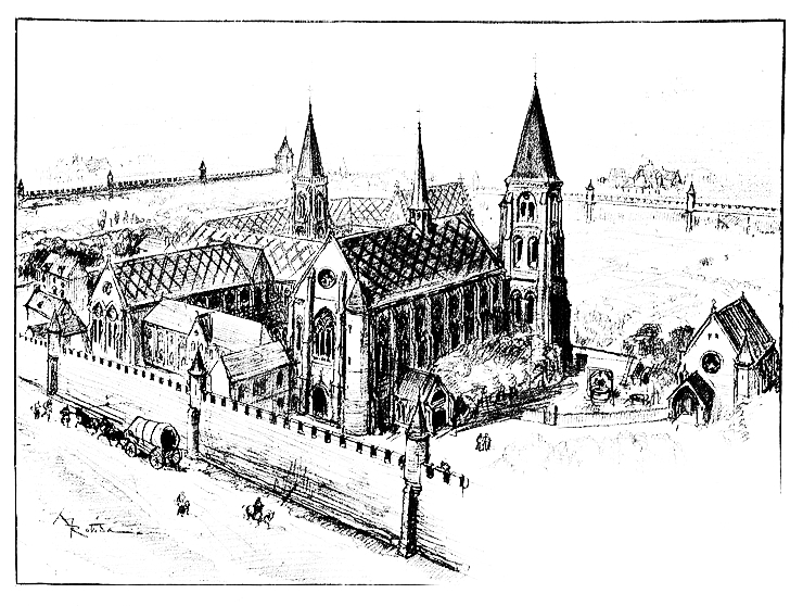 Les grandes abbayes se fondent dans la banlieue, s’entourent de murailles à l’abri desquelles viennent se grouper des habitations, embryons de bourgs que Paris enveloppera et absorbera un jour: l’abbaye de Sainte-Geneviève, proclamée patronne de Paris, sur qui elle semble veiller de la hauteur où le monastère est assis; l’abbaye de Saint-Germain des Prés, au milieu des prairies, presque sur la Seine, fondée par Childebert au VIᵉ siècle; l’abbaye de Saint-Denis, bourg plus éloigné, annexe de Paris que Paris n’a pas encore atteint, fondée en l’honneur du légendaire évêque de Lutèce, au IIIᵉ siècle, martyrisé à Montmartre, patron de Paris et des vignobles parisiens, quand il y avait encore des vignobles parisiens. Des églises s’élèvent dans les faubourgs et dans l’île, petites églises de la cité{16} qui se perpétueront, et qui disparaîtront dans les démolitions de la Révolution ou dans la grande transformation entreprise de nos jours dans l’île mère.