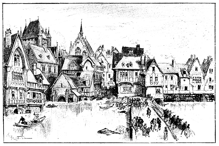 Une quatrième et une cinquième île, deux îlots plutôt, précèdent la grande nef que forme la Cité, ce sont les îlots de Bussy et de la Jourdaine où Philippe le Bel brûla les templiers et qui, réunies et constituées en terre-plein du Pont-Neuf, portent aujourd’hui la statue du Vert-Galant. Deux ponts de bois reliaient Lutèce aux oseraies de la rive, deux ponts bien modestes, qui cent fois détruits se perpétueront à peu près sur le même point et deviendront le pont au Change et le pont Saint-Michel.