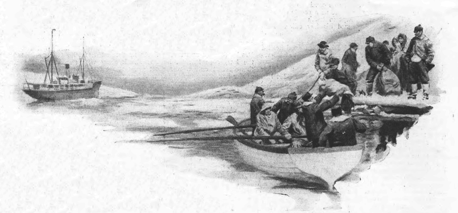 The little vessel was crowded, for her accommodation; badly overcrowded. But she was as fine a little sea vessel as money and human skill could make her and through many a gale of wind she had safely carried our friends. It was bitterly cold, the thermometer being actually away below zero, and our weatherwise people knew that something was brewing to windward that boded no good to a small boat however staunch, with only our long miles of harborless coast under her lea. Some at the risk of appearing self-interested, urged the old man to stay right on through the winter, and with that unbounded hospitality that is so universal a characteristic of our northern people were offering him a home, “baby and all.” But Uncle Joe’s philosophy is proof against any fears, indeed his faith is such real simple working material all through his life that the cynic calls it fatalism. So, as from those who saw St. Paul off on his long sea journey from the beach at Ephesus, not a few prayers went up for their friend and his helpless charge, as the little column of smoke once more disappeared into the sullen darkness that hung on the horizon under the southern sky, while the ominous soughing of the sea note on the rocks sent all hands back to make everything fast, even about the small homes on the land.