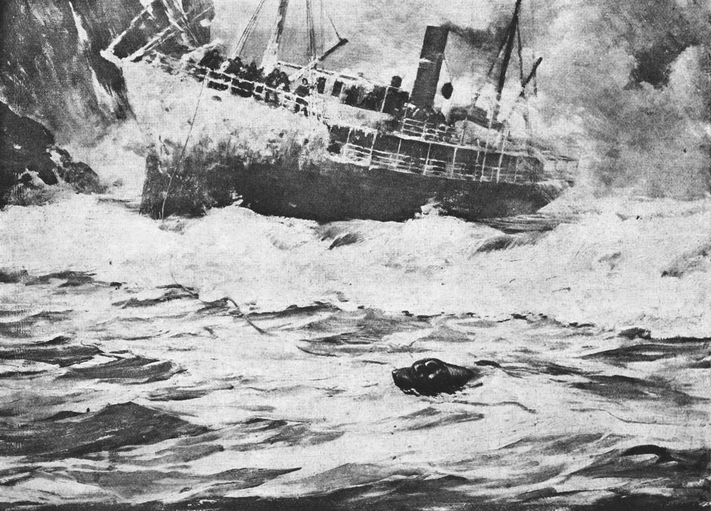 “They say it was only ten minutes or so more to the end—it seemed hours. The motion had changed and we knew we were before the sea. Then suddenly there was a heavy bump, that made us shiver from deck to keel on, then she seemed to stop, take another big jump, and then do the whole thing once more. We were on the beach and the water was flooding into the hold.