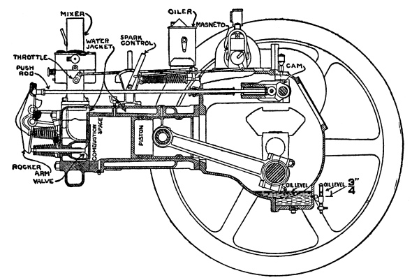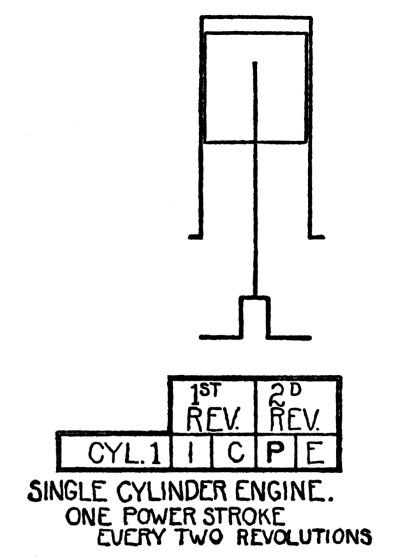 Power attained from heat—Combustible mixture—Principle of engine operation—Combustion space—Gas engine cycle—Dead strokes—Flywheel—Starting an engine—Inlet stroke—Compression stroke—Importance of compression—Ignition—Advance and retard of ignition—Power stroke—Exhaust stroke—Production of power—Vertical and horizontal engines—Firing order |
