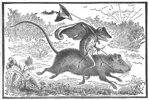 The moth-er-rat went to the door. "Ba-by!" she said. Ba-by came. "Jump on my back," she said. Then she gave a great jump, and a-way she went, her child on her back, down-stairs, down and down-stairs, in-to the cel-lar, and off out-doors.