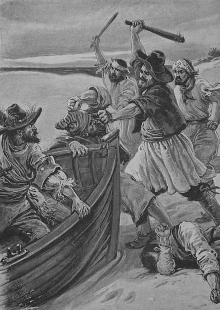 When they were sure that the people were in bed the conspirators had rushed the tower, and, with cutlass and pistol, had fallen upon the sentries which Heitman always had there. There was a stiff, stern fight for a[290] short while, and two of the sentries fell to the ground, dead, the third managing to get away, wounded and bleeding, to arouse Suchdorf and his other comrades. Suchdorf now began to realise that there had been something in Ball’s story, and, jumping out of bed, he dashed down to the door, followed by Alexander Foster, Peter Mingard, and George Jenesen. They put up a fine show, and succeeded in forcing the thieves out of the tower and fastening the door; after which they hurried upstairs and, looking out of a window, saw “a great multitude, whose faces were blacked.”