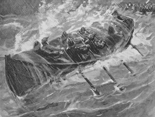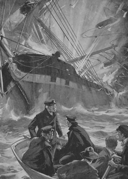 Down, down, down, seventy feet or more the boats were lowered, some having to pass the exhaust of the condensers, and running the risk of being swamped. An incident connected with one of these boats is worth mentioning. It was described by Mr. Beezley, a schoolmaster, who was in her as helper. There were no officers on board to help them work the boat, and no petty officer or member of the crew to take charge; and when it was seen that the boat was in danger of being[303] swamped by the water from the exhaust, one of the stokers cried: “Someone find the pin which releases the boat from the ropes and pull it up!” No one knew where it was. “We felt,” said Mr. Beezley, “as well as we could on the floor and along the sides, but found nothing. It was difficult to move among so many people. We had sixty or seventy on board. Down we went, and presently we were floating with our ropes still holding us, and the stream of water from the exhaust washing us away from the side of the vessel, while the swell of the sea urged us back against the side again.
