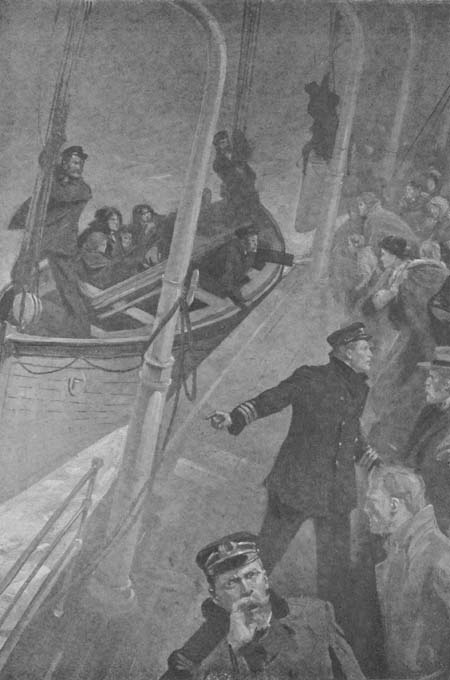 Boat crews were shipped; and then the craft were swung out, though not without trouble, seeing that, being new, the tackle was not easy to work; and the women and children, ill-clad to withstand the rigours of that bitter night, were helped into the boats and lowered away, out of the floating palace they had thought so safe into a wide expanse of sea, with all its possible dangers. Some women, indeed, refused to leave the ship; they would not go without their husbands, pleaded that they be allowed to come. Like heroes, the men refused to go, and so husbands and wives stayed on the ship of death.